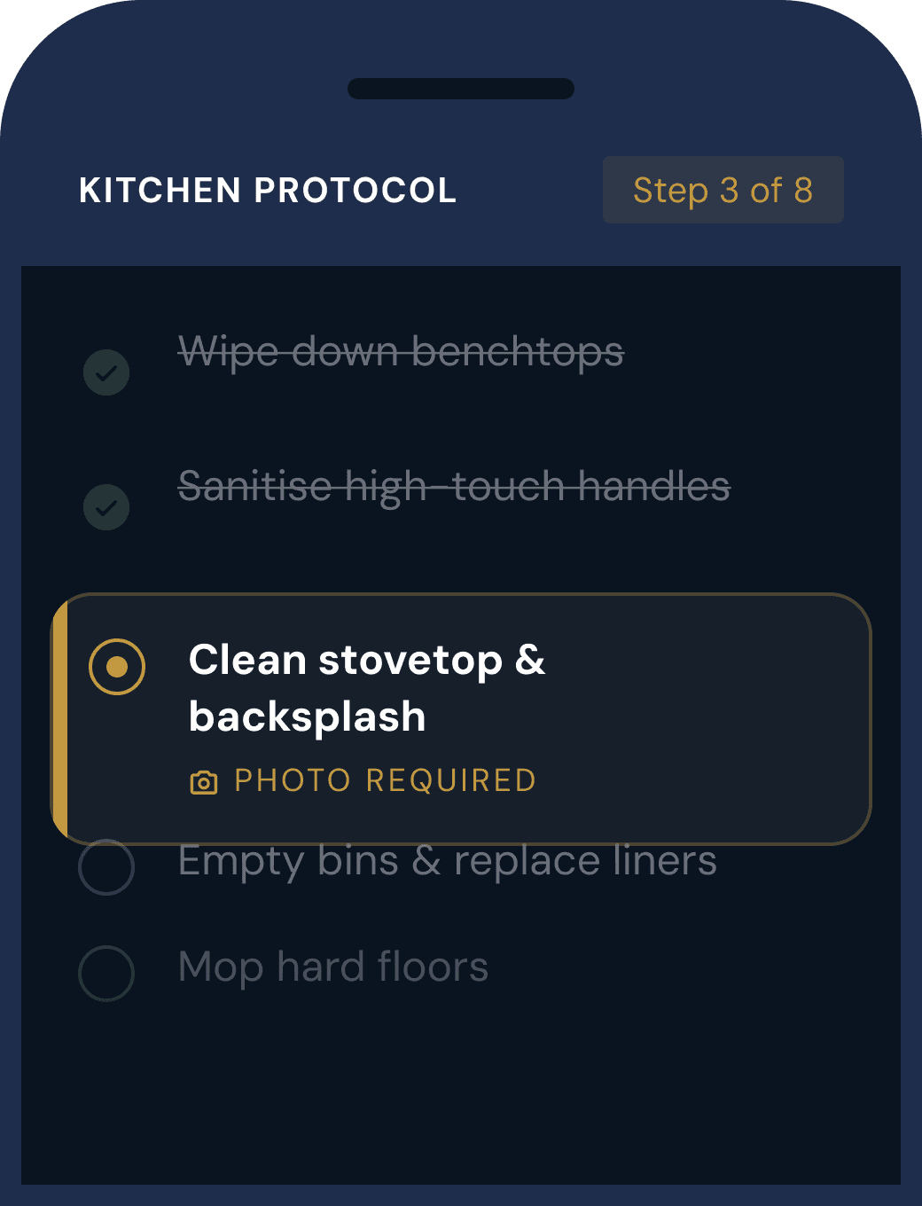 Step-by-step prompts. The system dictates the flow, enforcing strict standards so cleaners simply cannot take shortcuts.